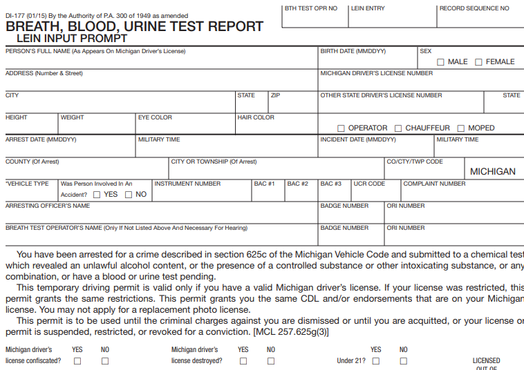 Form DI-177 — officially titled the Breath, Blood, Urine Test Report — is issued in the vast majority of drunk driving cases. It is given to motorists who submitted to chemical testing. If you received a DI-177, you are not facing an implied consent suspension, though the results of the test may still be used against you in the criminal case.