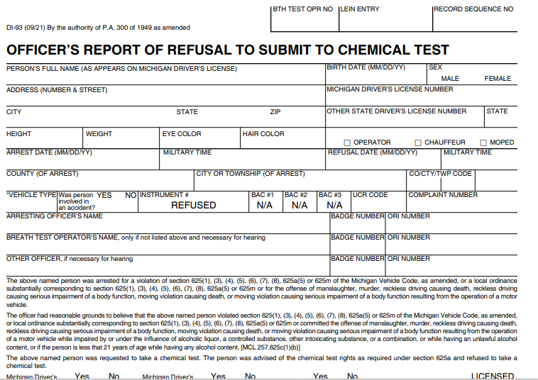If you were arrested for drunk driving in Michigan and refused to submit to a breath or blood test, you are facing a separate and serious set of consequences that have nothing to do with whether you are ultimately convicted of the underlying offense. Michigan’s implied consent law operates independently of the criminal case. You can be completely sober — not a trace of alcohol in your system — and still lose your license for a year and have six points added to your driving record, as long as the officer had probable cause to believe you were intoxicated when he made the arrest.